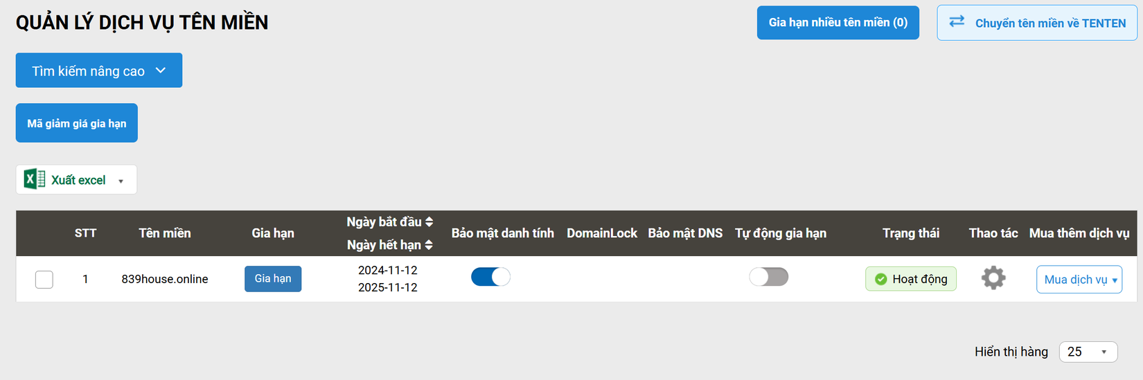 Trạng thái Hoạt Động thì bạn đã thành công mua được tên miền cho mình rồi, Bây giờ đến bước tiếp theo trỏ tên miền về địa chỉ IP public của bạn.