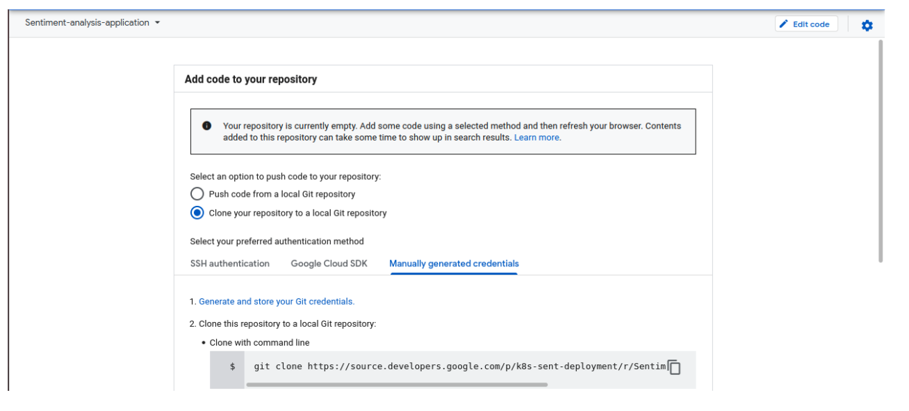 Sau khi Cloud Source Repository đã được khởi tạo, chúng ta sẽ được redirect sang page để Add code to your repository. Có thể lựa chọn Clone repository tới local Git repository hoặc chạy theo các step dưới đây để Tạo credentials manually.