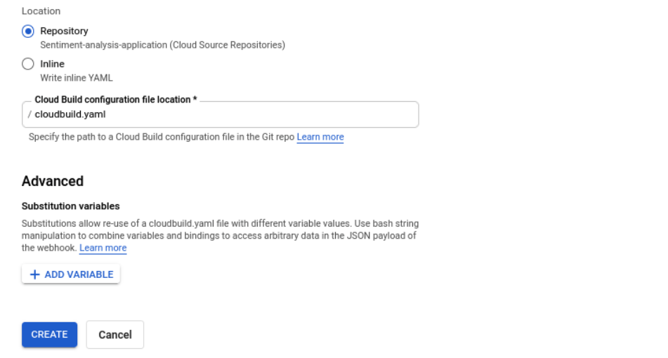 Ở page tiếp theo, chọn event how to trigger the pipeline và cung cấp Repository và Branch for monitoring for any changes, chọn type Cloud Build config và cung cấp file location sau đó click CREATE