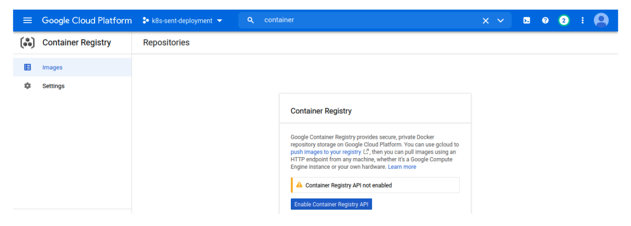 Để dử dụng được service chúng ta cần active API, search Container registry ở search bar, và ở page tiếp theo click vào Enable Container Registry API button