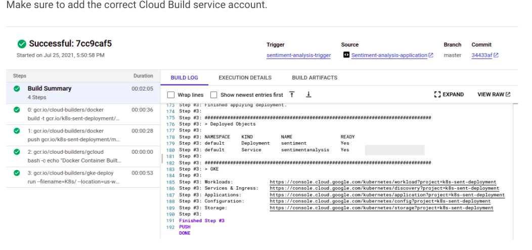 Đầu tiên, hãy cùng check manual process, click RUN sau đó click RUN TRIGGER, pipeline sẽ bắt đầu chạy và follow các steps dưới đây trên Cloud Build YAML file. sẽ tốn khoảng 3-4 phút để hoàn thành việc build. Một khi build hoàn thành thì chúng ta có thể check container registry cho docker image và Kubernetes Engine để confirm Workloads và Service đang chạy. Nếu build fails chúng ta có thể xem logs và check xem lỗi ở đâu để fix.