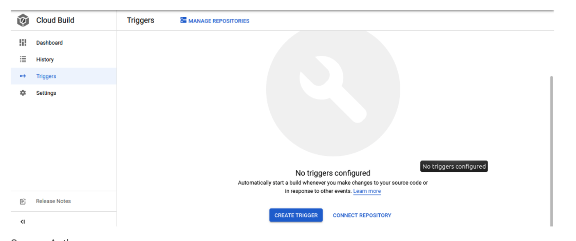Để tạo một Trigger, search Cloud Build trên console và click CREATE TRIGGERS