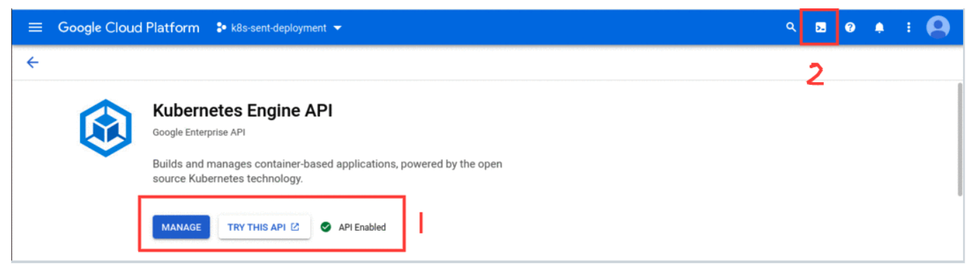 Sau khi API đã được enable, chúng ta cần tạo một cluster. Để open cloud shell, chúng ta cần tìm icon trên top phải màn hình để Activate Cloud Shell như sau: