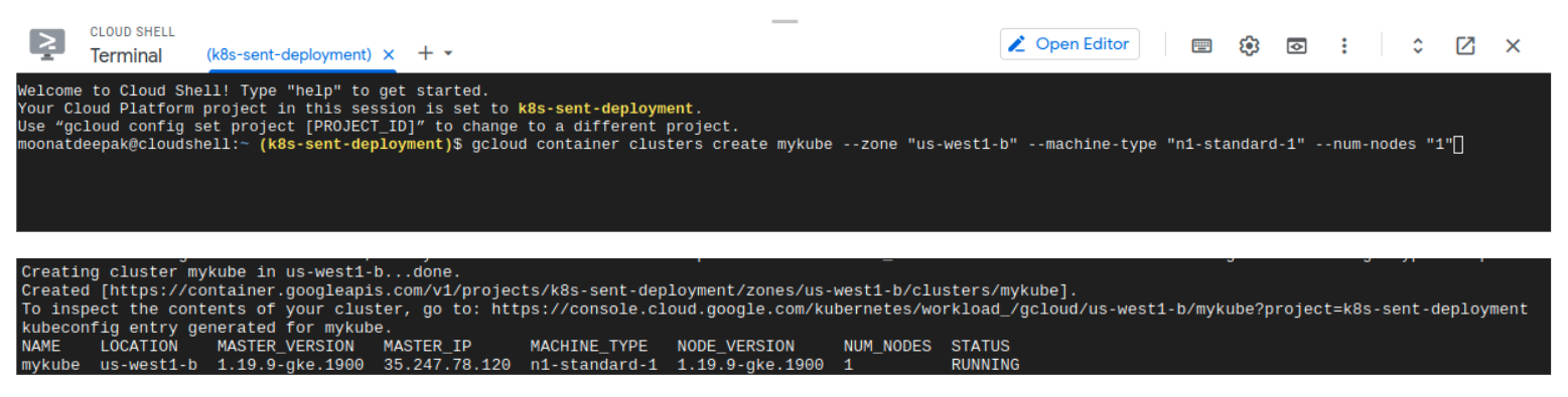 create cluster gcloud container clusters create mykube --zone "us-west1-b" --machine-type "n1-standard-1" --num-nodes "1"