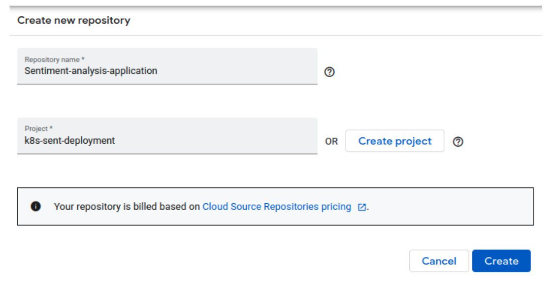 Chọn Create a new repository, input repository name và chọn project chúng ta đã khởi toạ trước đó sau đó click Create