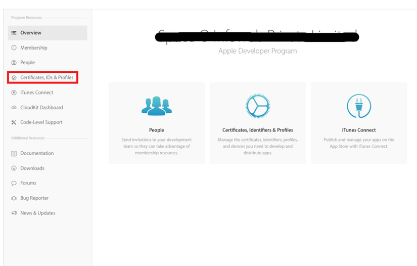 Sau khi đã hoàn tất để trở thành App Developer, chúng ta sẽ bắt đầu tạo distribution certificate. Chọn Tab Certificates, IDs, Profiles ở menu bên trái màn hình để mở tab quản lí App profile.