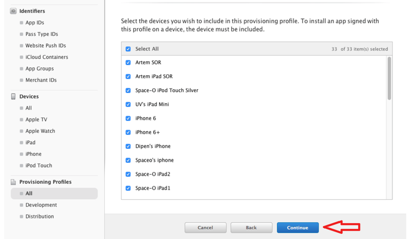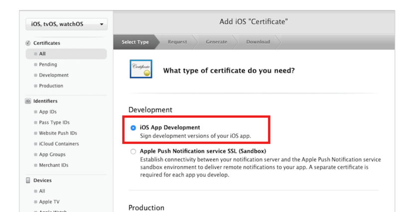 - Developement Certificate: Trong quá trình phát triển ứng dụng, bạn cần phải build App trên device thật để hỗ trợ testing. Do đó, certificate này giúp App của bạn có thể run trên các devices nội bộ đã được đăng kí sẵn. Những device ko được đăng kí sẽ ko thể run App.