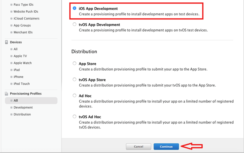 - Development provisioning: tương tự development certificate, development provisioning hỗ trợ trong qúa trình phát triển, giúp có thể build App lên device iOS.