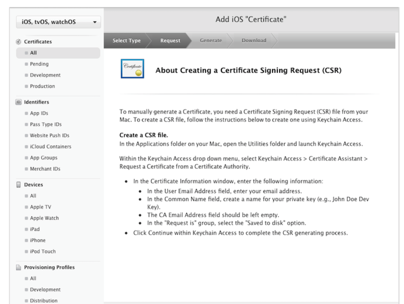 Certificate: Đối với các thiết bị iOS (non-jaibreak), các ứng dụng chỉ có thể run khi được tải từ App Store và được cấp phép bởi một chứng chỉ của Apple. Chứng chỉ đó gọi là Certificate. Khi build một ứng dụng chúng ta cần nhúng vào đó certificate được cấp bởi Apple. Khi run App, các thiết bị sẽ tiến hành verify chứng chỉ đó. Nếu hợp lệ thì chứng chỉ sẽ được run và ngược lại. Certificate gồm 2 loại: