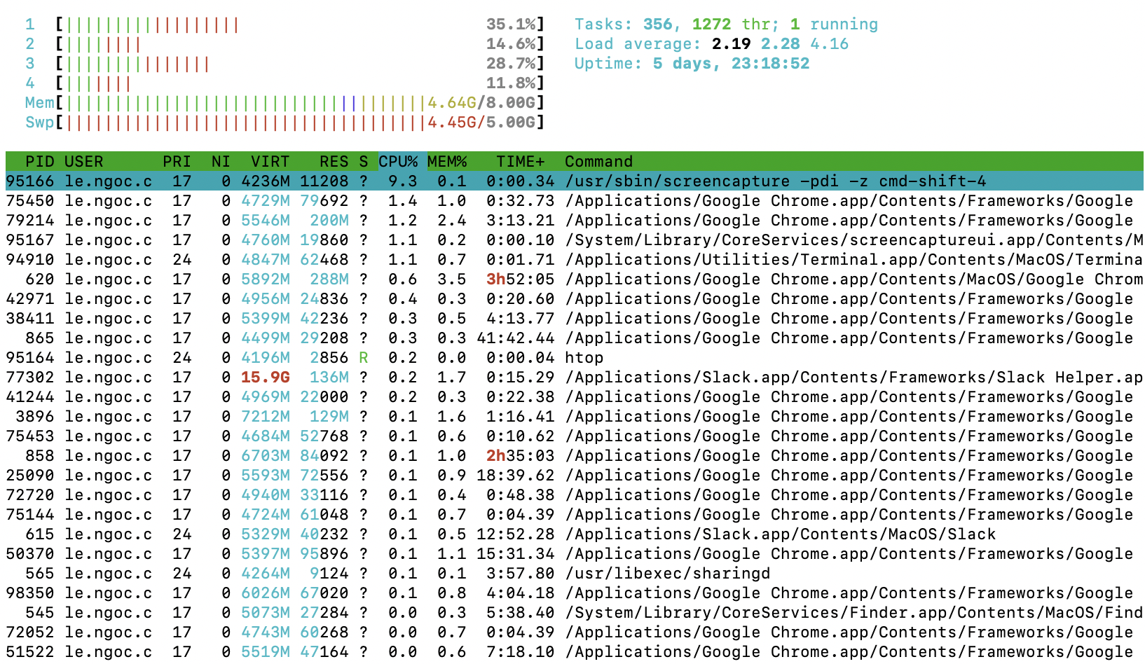 Tương tự như lệnh top, lệnh htop cũng hiển thị mức sử dụng bộ nhớ cùng với nhiều chi tiết khác.