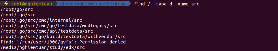 - Tìm kiếm các thư mục (-type d) viết tắt là directory, có tên là src: