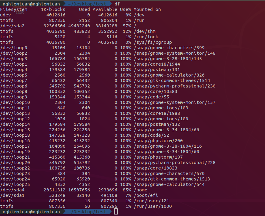 Lệnh này được sử dụng để lấy thông tin usage disk. Dạng cơ bản của nó sẽ in thông tin về các disk được gắn: