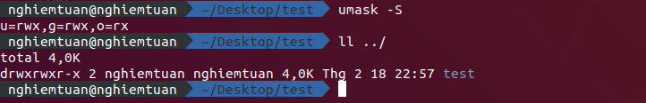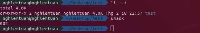 Tại sao là 002. Bạn thử lấy 777 - 775 mà xem có gì đặc biệt không? ồ. Cái thư mục cha (test) có quyền là 775 nên umask (hiểu là ngược lại của chmod) là lấy 777 trừ đi quyền hiện tại là ra. Nếu khó hiểu sử dụng thêm đối số -S đỡ phải nghĩ.
