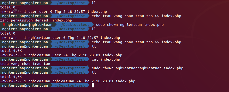 Dưới đây sẽ là 2 command được sử dụng nhiều nhất khi sử dụng file. Liên quan đến quyền truy cập: chown - chmod.