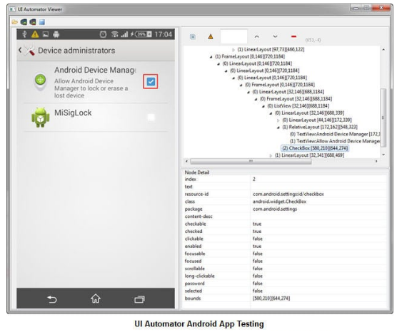 Công cụ này gần đây đã được Google xây dựng. Nó hỗ trợ các phiên bản Android bắt đầu từ 4.1. Bạn nên chọn một công cụ test ứng dụng Android khác để tự động kiểm tra cho các phiên bản trước. UI Automator có thể tương tác với tất cả các loại phần mềm cho Android, bao gồm cả các ứng dụng hệ thống. Điều này cho phép UI Automator có thể khóa và mở khóa điện thoại hoặc máy tính bảng.