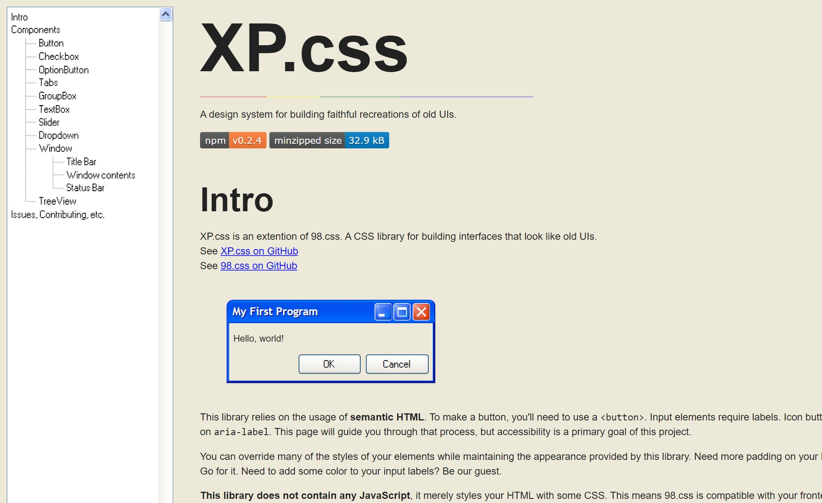 Kế thừa ý tưởng và bố cục của 98.css, XP.css được phát triển và bổ sung thêm vài component, cùng với một khung xương SCSS được tách ra để phục vụ việc phát triển và bảo trì dễ dàng hơn. Một bộ framework lý tưởng dành cho các bạn gắn bó với Windows XP một thời.