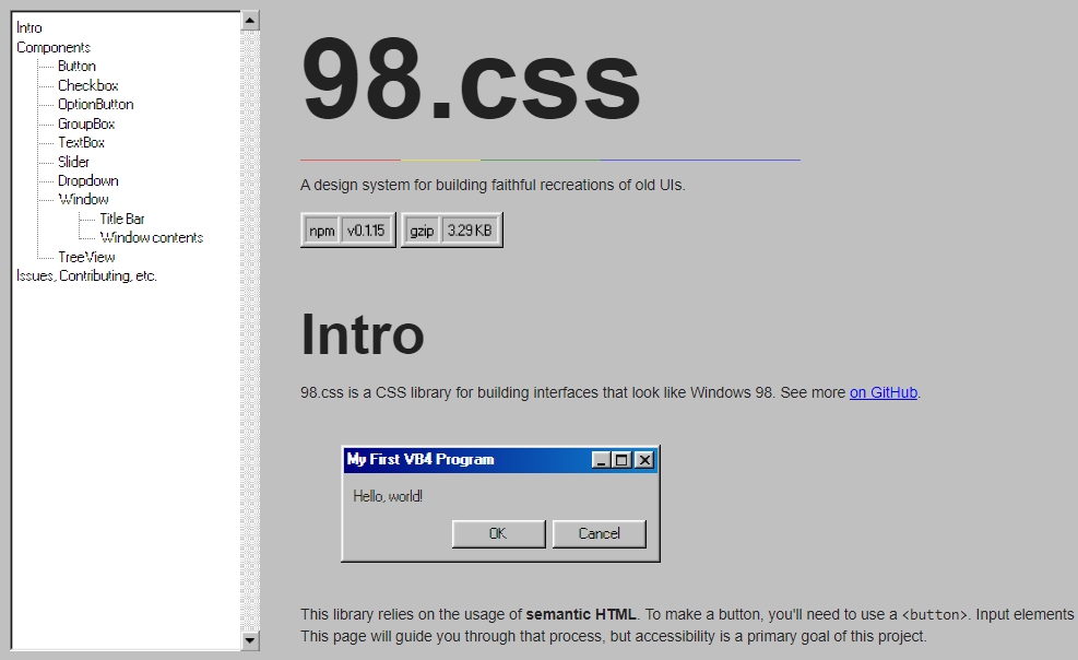 Một trang web có giao diện như Window 98? Tại sao không? 98.css là một CSS framework cho phép các bạn thiết kế các component theo kiểu Windows 98, không hoàn toàn sử dụng class mà tập trung sử dụng semantic HTML và tính a11y (accessibility) cho các component. Chắc hẳn khi nhìn thấy bộ framework này, không ít người được gợi nhớ lại ký ức tuổi thơ với một hệ điều hành từng gắn bó một thời.