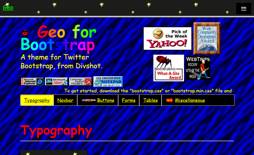 Geo là một bộ theme nữa dành cho Bootstrap, một cỗ máy thời gian đưa bạn trở lại thời xa xưa với kiểu thiết kế giao diện đẹp... nhức nhối.