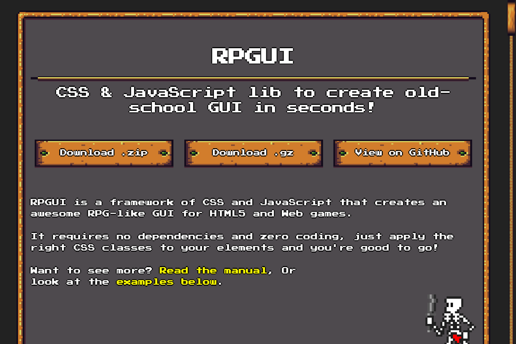 Một tấm vé khác đưa bạn trở về tuổi thơ, RPGUI là một CSS Framework dành cho những bạn từng một thời đam mê và lớn lên với dòng game RPG 8-bit. RPGUI hỗ trợ tương đối nhiều component, gồm cả scrollbar và cursor, thật ấn tượng!