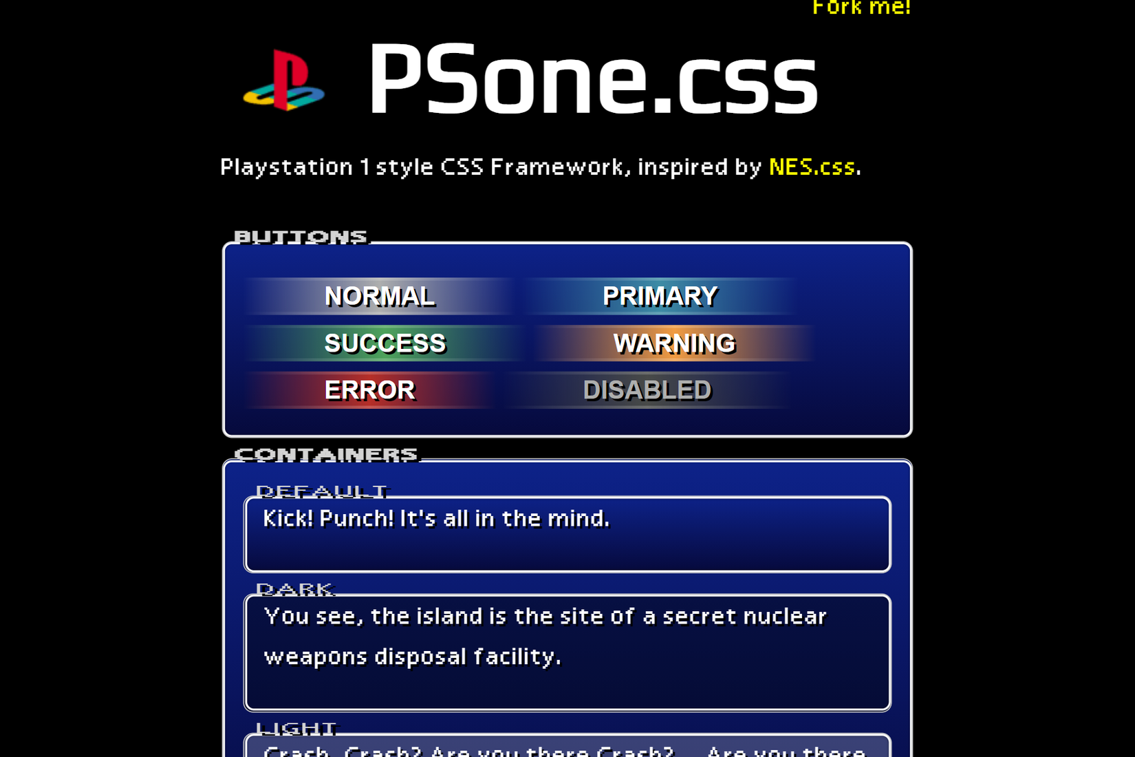Có một CSS framework cho NES của Nintendo rồi thì tại sao lại không có một cái cho Playstation của Sony nhỉ? PSone.css là chính câu trả lời. Tuy số lượng component được hỗ trợ còn khá ít, nhưng các component được thiết kế rất sát với phong cách 16-bit của PlayStation 1. Một framework để nghịch, học hỏi cũng hay chứ.
