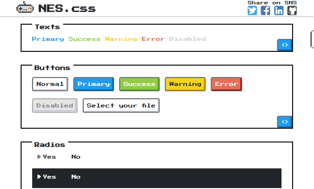 Đứng đầu danh sách là một CSS framework dành cho các tín đồ 8-bit NES (Nintendo Entertainment System), hay được biết tới nhiều nhất với cái tên "máy chơi game 4 nút" lúc đương thời. Xin chúc mừng những bạn có tuổi thơ gắn liền với dòng máy này, vì đây là một framework dành cho bạn để làm sống lại ký ức tuổi thơ.