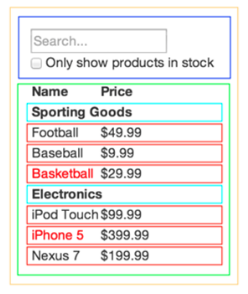 Trong ví dụ này chúng ta sẽ chia khung danh sách sản phẩm là 1 component, khung tìm kiếm là 1 component, các item sản phẩm là 1 component. Như vậy, Component giúp cho React thực hiện tốt các nguyên tắc trong OOP như: