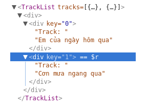 Gợi ý: Bởi vì React component cần thuộc tính key để xác định bản thân nó trong một list các components. Hãy sửa nó bằng cách thêm key vào div hiển thị tên bài hát. Sau khi sửa, chỉ cần đơn giản save file, lúc này react-hot-reload sẽ làm nhiệm vụ của nó, các bạn chỉ cần đơn giản là nhìn vào console và không thấy lỗi hiển thị nữa.