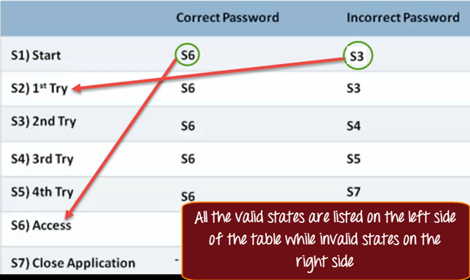 Ví dụ: Khi ở trạng thái S1, bạn nhập mật khẩu chính xác, bạn được đưa đến trạng thái S6 (Cấp quyền truy cập). Giả sử nếu bạn đã nhập sai mật khẩu ở lần thử đầu tiên hoặc Lần 2, bạn sẽ được đưa đến trạng thái S3.