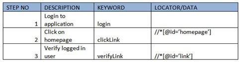 Trong ví dụ trên, cột keyword chứa tất cả các từ khóa bắt buộc được sử dụng trong test case cụ thể và cột dữ liệu chứa tất cả dữ liệu được yêu cầu trong kịch bản test. Nếu bất kỳ bước nào không cần bất kỳ đầu vào nào thì có thể để trống.
