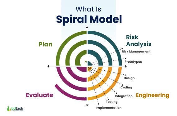 4. Spiral Model (Mô hình xoắn ốc): Kết hợp các yếu tố của mô hình thác nước và mô hình lặp lại. Mô hình này chia dự án thành các vòng lặp nhỏ, mỗi vòng lặp bao gồm các giai đoạn như xác định yêu cầu, phát triển và kiểm thử.