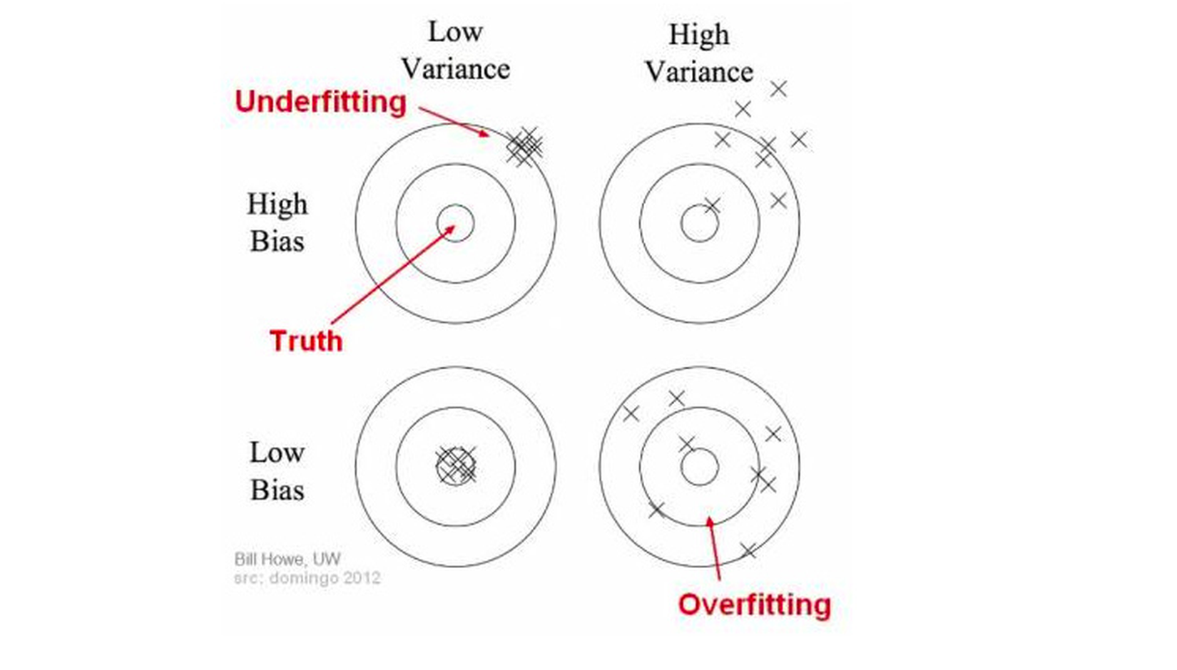 Underfitting là mô hình mà high bias và variance low. Hiện tượng này xảy ra khi lượng dữ liệu quá ít hoặc ta cố gắng mô tả các dữ liệu phức tạp bằng các mô hình tuyến tính đơn giản như hồi quy. Khi gặp trường hợp này ta phải kiếm thêm data và tăng độ phức tạp của model ( tăng thêm 1 vài layer, node).