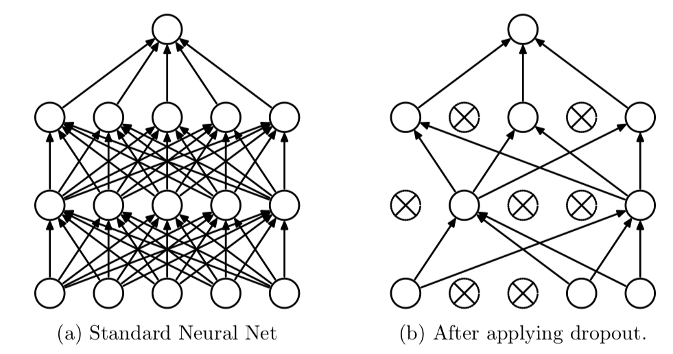 Dropout là kĩ thuật giúp tránh overfitting cũng gần giống như regularization bằng cách bỏ đi random p% node của layer => giúp cho mô hình bớt phức tạp (p thuộc [0.2, 0.5]) .