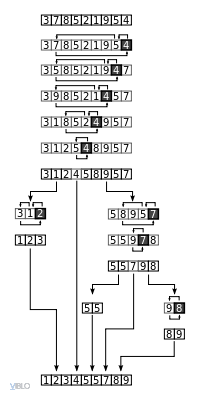 - Trị (Conquer): Sắp xếp mỗi dãy con một cách đệ quy sử dụng sắp xếp trộn. Khi dãy chỉ còn một phần tử thì trả lại phần tử này.