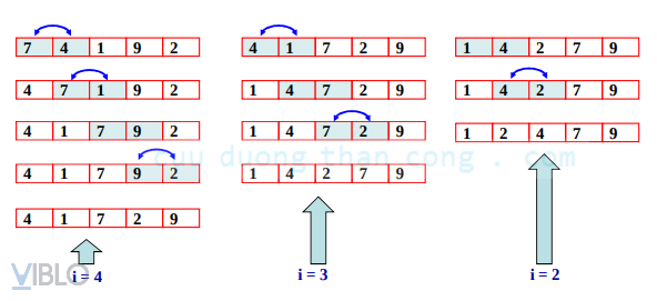 - Tại bước k = 1, 2, ..., n đưa phần tử thứ k trong mảng đã cho vào đúng vị trí trong dãy gồm k phần tử đầu tiên.