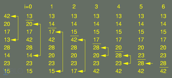 Thuật toán: Duyệt mảng từ phần tử đầu tiên. Ta sẽ so sánh mỗi phần tử với phần tử liền trước nó, nếu chúng đứng sai vị trí, ta sẽ đổi chỗ chúng cho nhau. Quá trình này sẽ được dừng nếu gặp lần duyệt từ đầu dãy đến cuối dãy mà không phải thực hiện đổi chỗ bất kì 2 phần từ nào (tức là tất cả các phần tử đã được sắp xếp đúng vị trí).