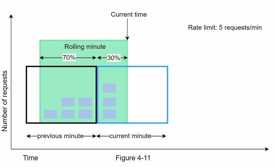 Giả sử bộ giới hạn truy cập cho phép tối đa 7 yêu cầu mỗi phút và có 5 yêu cầu trong phút trước và 3 yêu cầu trong phút hiện tại. Đối với một yêu cầu mới đến vị trí 30% trong phút hiện tại, số lượng yêu cầu trong vùng chồng chéo giữa hai window được tính bằng công thức sau: Số yêu cầu ở cửa sổ hiện tại + số yêu cầu ở cửa số trước * phần trăm chồng chéo giữa hai cửa sổ. Sử dụng công thức trên ta có 3 + 5 * 0.7% = 6.5 yêu cầu. Tuỳ vào trường hợp mà con số có thể được làm tròn lên hoặc xuống. Ở đây ta làm tròn xuống còn 6. Vì bộ giới hạn truy cập cho phép tối đa 7 yêu cầu mỗi phút, nên yêu cầu hiện tại có thể được thực hiện. Tuy nhiên, giới hạn sẽ đạt được khi nhận được thêm một yêu cầu mới.