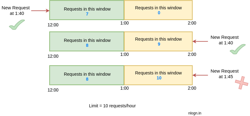 Song nó lại có một hạn chế lớn, ví dụ một hệ thống cho phép tối đa 5 yêu cầu mỗi phút, định mức khả dụng đặt lại gần bằng phút. Và có 5 yêu cầu trong khoảng thời gian từ 2:00:00 đến 2:01:00 và 5 yêu cầu khác trong khoảng 2:01:00 đến 2:02:00. Đối với khoảng thời gian một phút từ 2:00:30 đến 2:01:30, thì lại có 10 yêu cầu. Gấp đôi với số yêu cầu được cho phép. Việc lưu lượng truy cập tăng vọt ở cạnh của window có khả năng gây ra nhiều yêu cầu hơn định mức cho phép