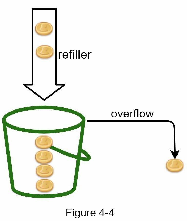 Token bucket hiểu nôm na sẽ là một thùng (bucket) đựng các đồng tiền (token). Ý tưởng của thuật toán này như sau: Một bucket là một thùng chứa có dung lượng đã xác định trước. Các token là các đồng tiền được đặt vào theo định kỳ. Khi mà bucket đã đầy thì không có token nào được thêm vào. Như hình bên dưới, dung lượng bucket là 4. Mỗi giây, bộ nạp sẽ đặt 2 token vào. Khi bucket đầy các token tiếp theo sẽ bị tràn ra ngoài.