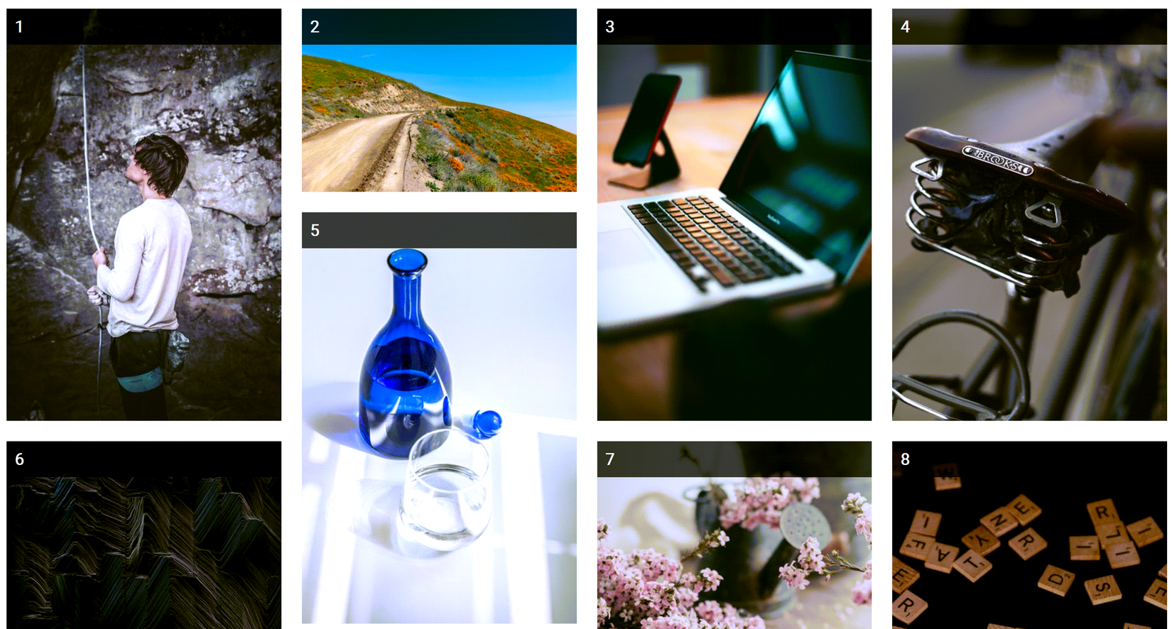 Phân trang web ra hẳn 3 column, rồi tính toán để phân chia các tấm ảnh vào từng column Tính toán trước ở backend (hoặc hardcode) kích thước các tấm ảnh theo một quy tắc của bạn. Sau đó sử dụng position absolute + một tí javascript Tự viết javascript thuần để tính toán và sắp xếp các tấm ảnh Sử dụng thư viện hỗ trợ như https://masonry.desandro.com/ Với sự ra đời của CSS Grid, việc tạo Masonry layout đã đơn giản hơn, tuy nhiên nó cũng không phải là giải pháp "native". Bản chất CSS Grid là để tạo grid, chứ không phải tạo ra Masonry layout.