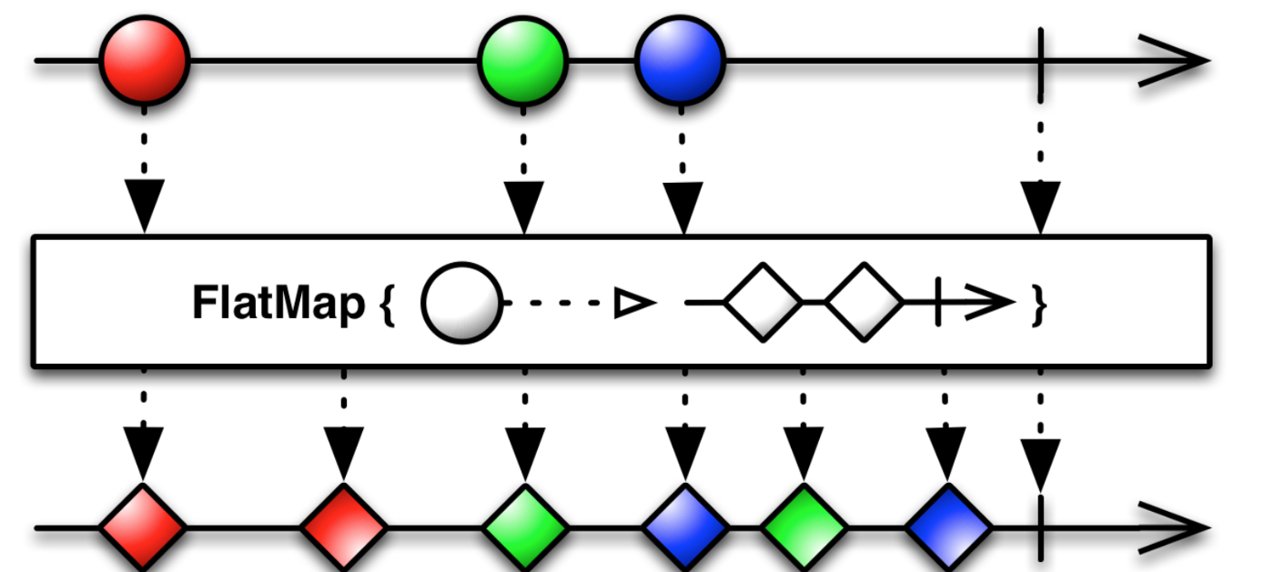 flatMap là operator mà sẽ chuyển đổi mỗi items mà Observable nguồn ra thành nhiều Observables, sau đó gộp chúng lại trên một Observable đích