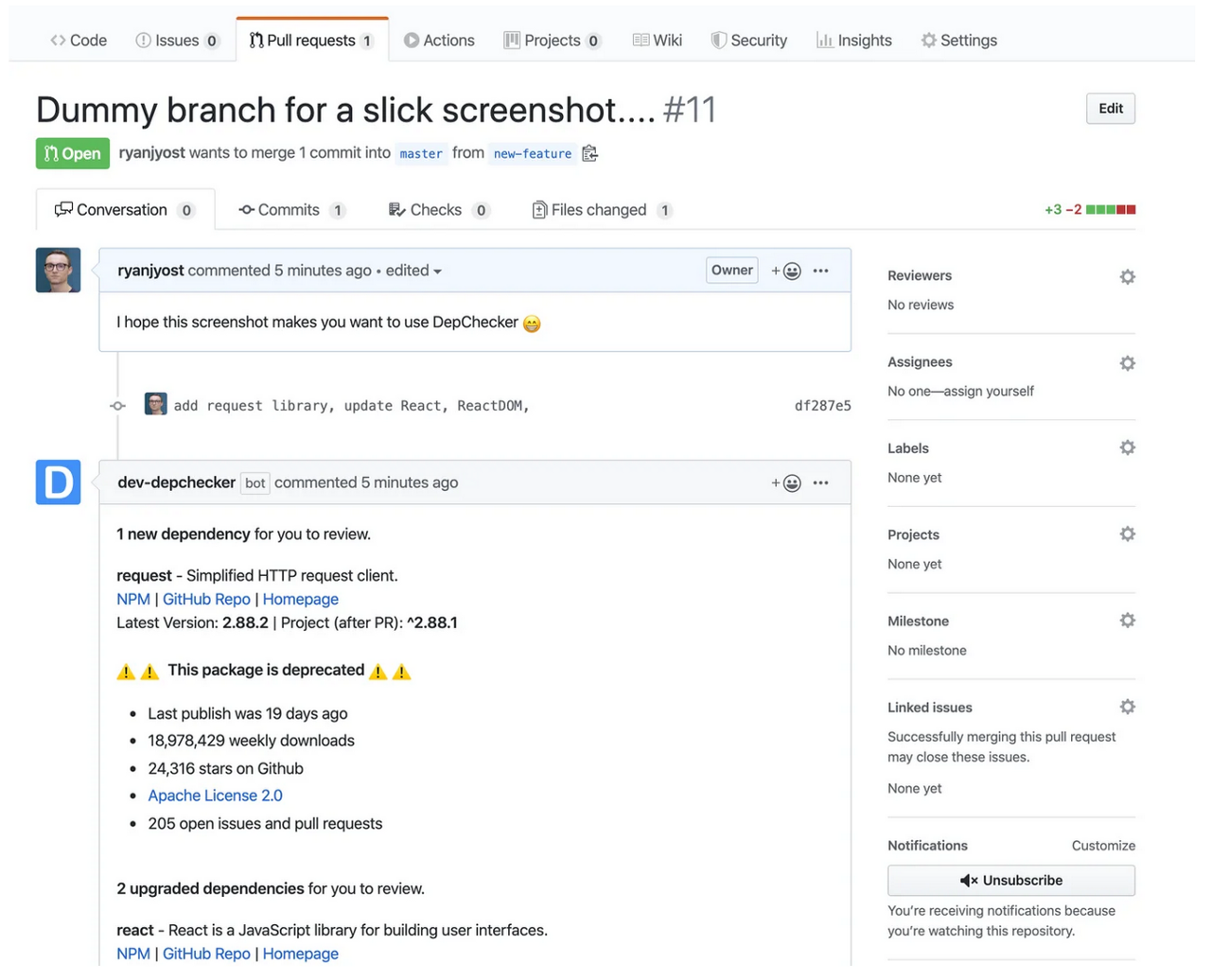 Không ai có thể nói rằng chúng ta có thể tin tưởng chủ sở hữu của những Dependency? Ai nói rằng mã là hoàn hảo và không có lỗi hoặc vấn đề hiệu suất? Mặc dù không phải là ngôn ngữ duy nhất có, nhưng ở đây tôi sẽ nói về Node.js và đây là một sự tích hợp mà bạn có thể quan tâm: DepChecker-Bot