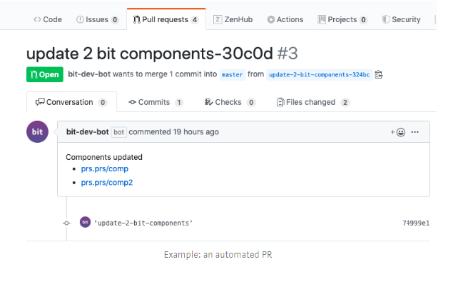 Bit gần đây đã ra mắt với BitDevBot mới, bot Github tự động hóa các yêu cầu PR vào kho lưu trữ với các thành phần được import. Vì vậy, bất cứ khi nào một thành phần được cập nhật, tất cả các kho lưu trữ có liên quan đều được nhắc hợp nhất các thay đổi mới. Đây không chỉ là một cách để đảm bảo người dùng của các thành phần không bao giờ bỏ lỡ các bản cập nhật quan trọng mà còn là cách để nhận các bản cập nhật thành phần trong khi vẫn giữ các thay đổi cục bộ được thực hiện cho một thành phần trong một dự án cụ thể.