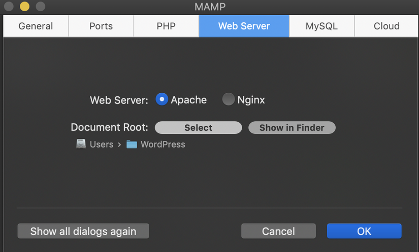Bước 1: MAMP -> Preferences -> Web Server -> Select