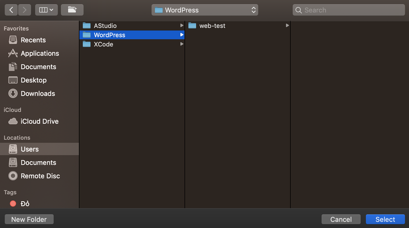 Bước 2: Chọn thư mục bạn muốn lưu file web, m đang trỏ hiện tại về WordPress folder