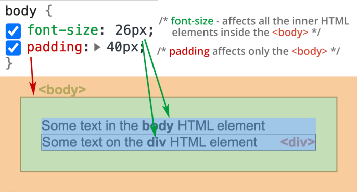Khi chúng ta debug code ở trên bằng cách sử dụng tính năng “inspect element” trên phần tử HTML div , browser’s developer tools của trình duyệt sẽ cho chúng ta thấy có các kiểu kế thừa từ phần tử HTML body.