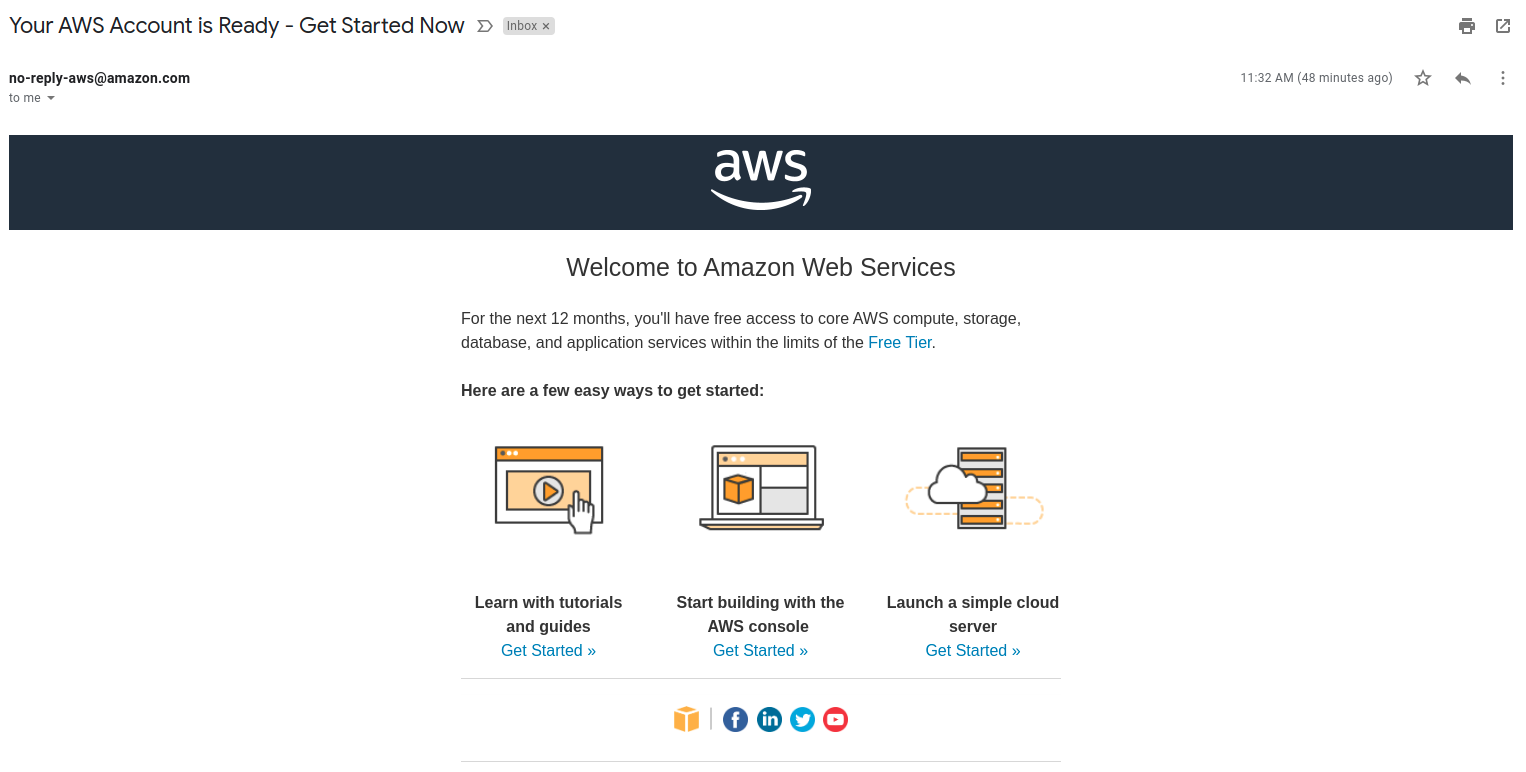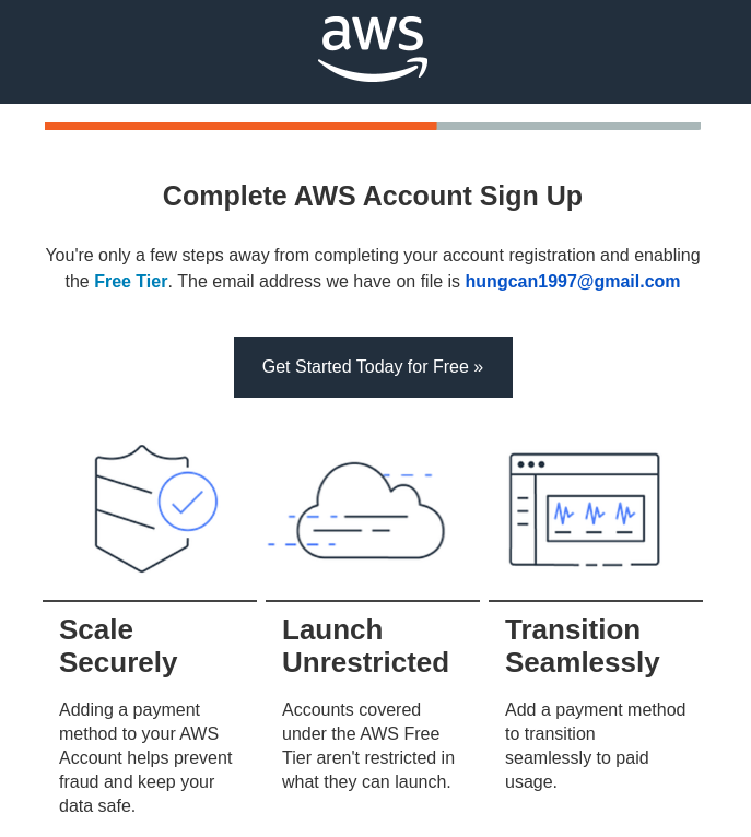 Đầu tiên các bạn đăng ký tài khoản AWS. Sau đó bạn nhận được mail như thế này: