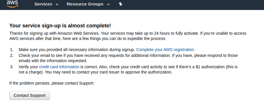 Bạn kiên nhẫn chờ đợt khoảng tầm 1 tiếng sẽ có thông báo gửi mail để kích hoạt dịch vụ. Bạn bây giờ có thể sử dụng 1 năm miễn phí để xài AWS rồi