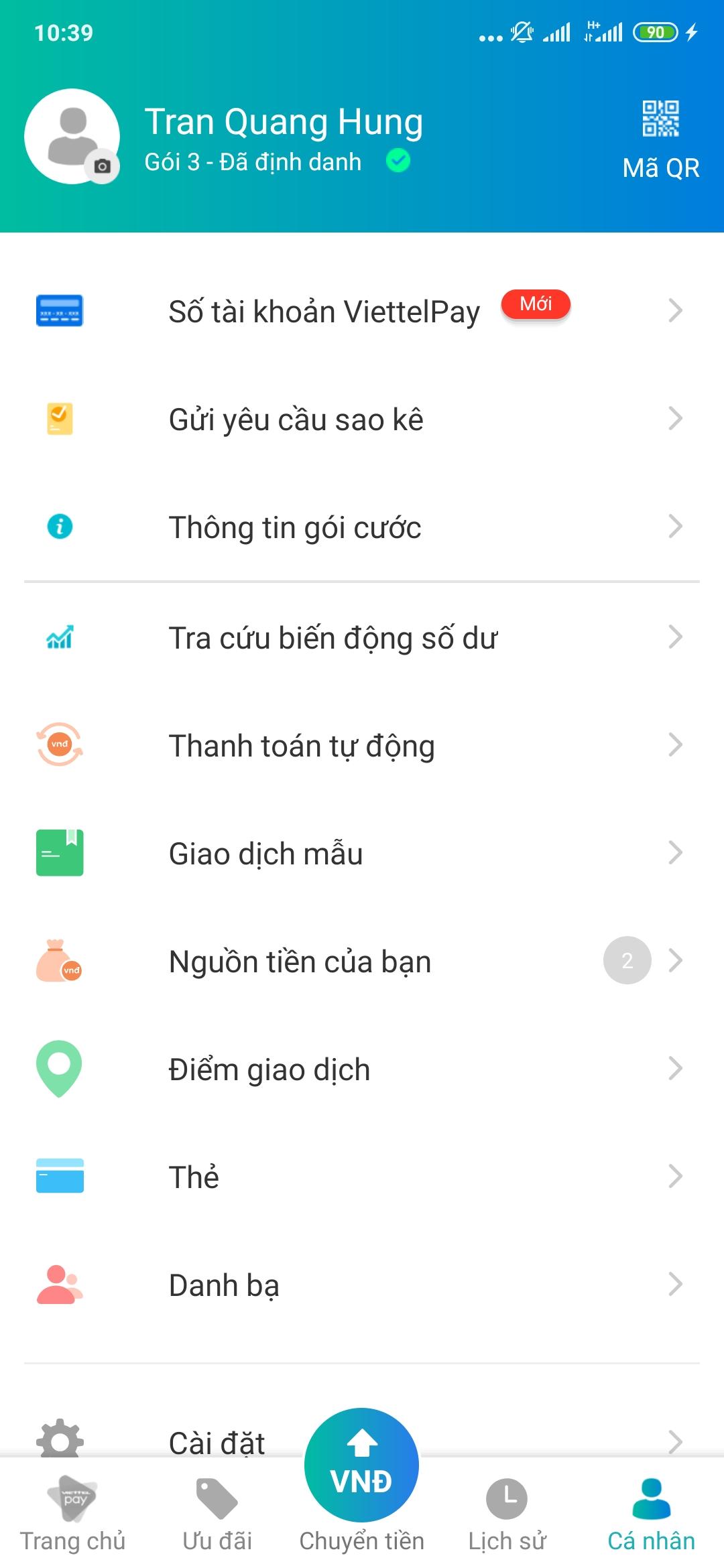 Mở ứng dụng ViettelPay, mục Cá Nhân ở góc phải màn hình