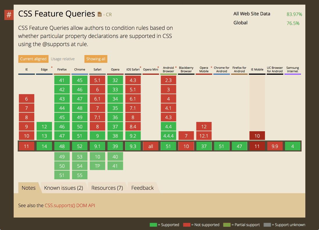 Hiện tại thuốc tính @supports vẫn còn hạn chế trong việc hỗ trợ các trình duyệt nên chúng ta cần cân nhắc khi sử dung, chi tiết về việc hỗ trợ của các trình duyệt chúng ta có thể xem ở bảng bên dưới