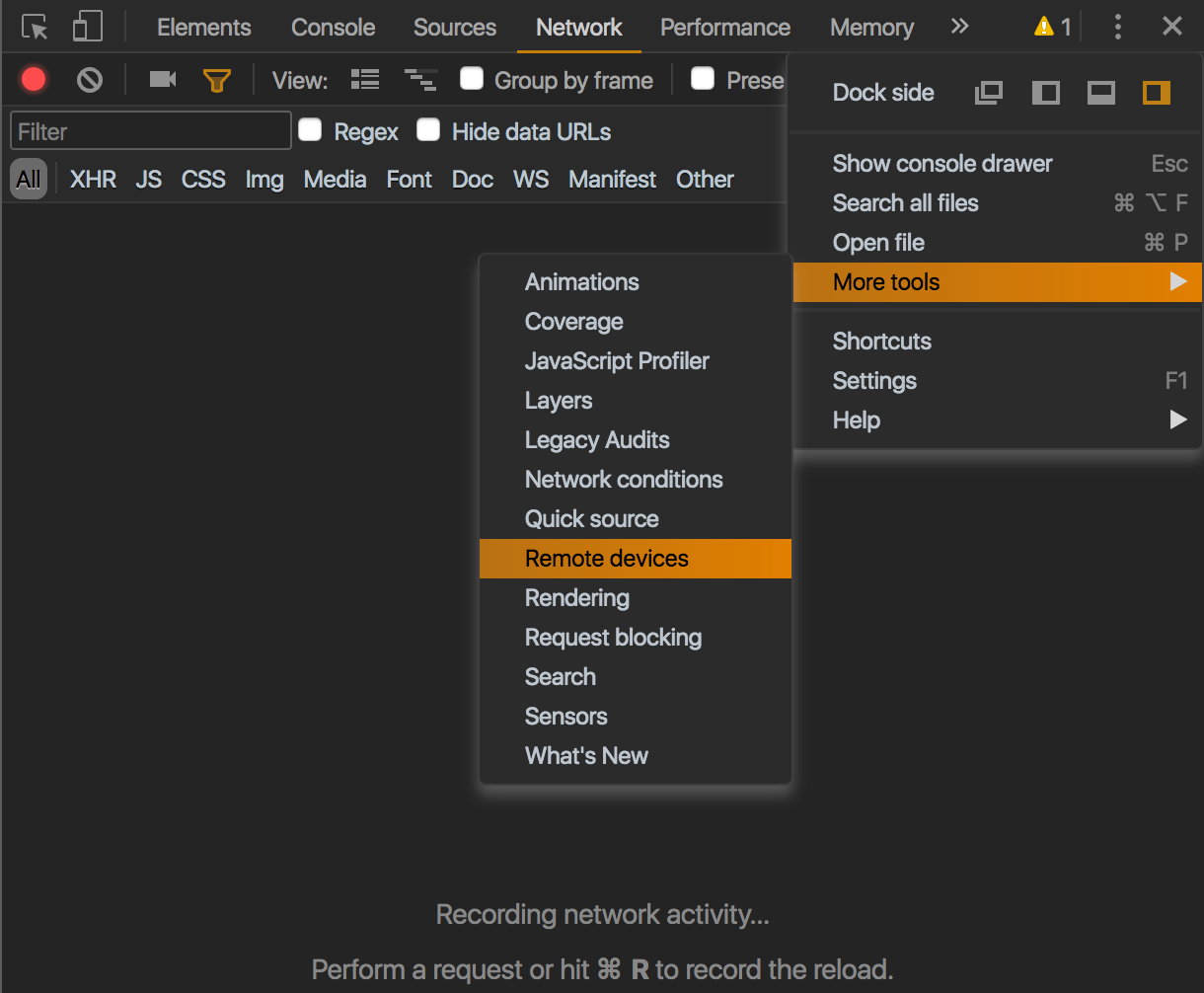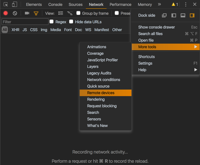 - Trên máy tính của bạn, mở developer tools bằng F12. Ở góc phải màn hình, kích vào button 3 chấm và chọn More tools -> Remote Devices.